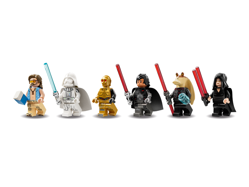 - 6 LEGO® Star Wars™ minifiguren – Darth Jar Jar, premiejager C-3PO, Darth Dev, Darth Rey, Strand Luke en Jedi Vader, plus accessoires waaronder lichtzwaarden en een pak blauwe melk